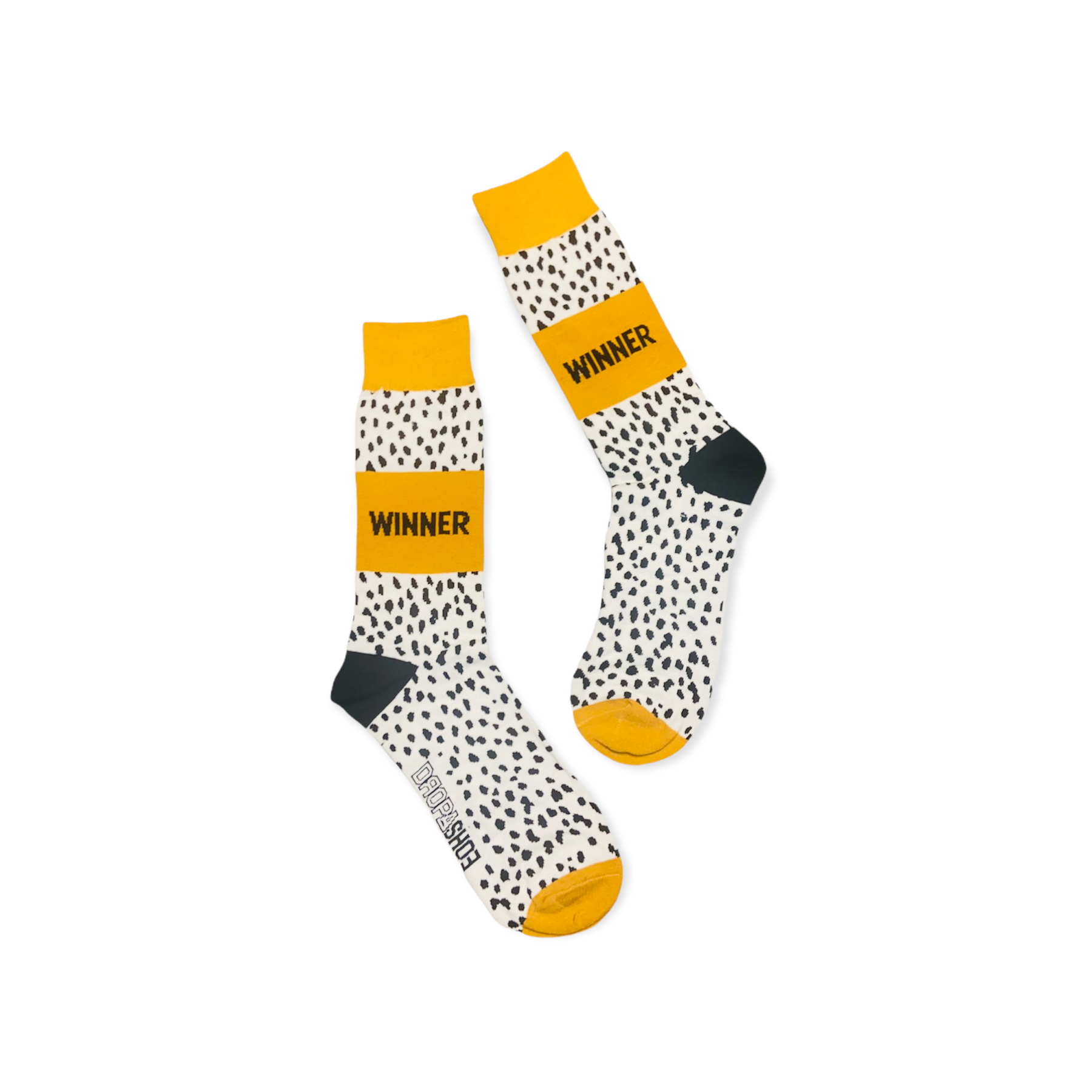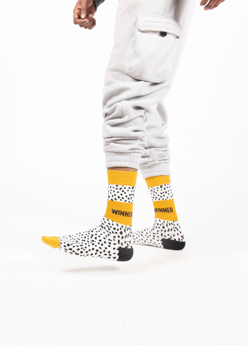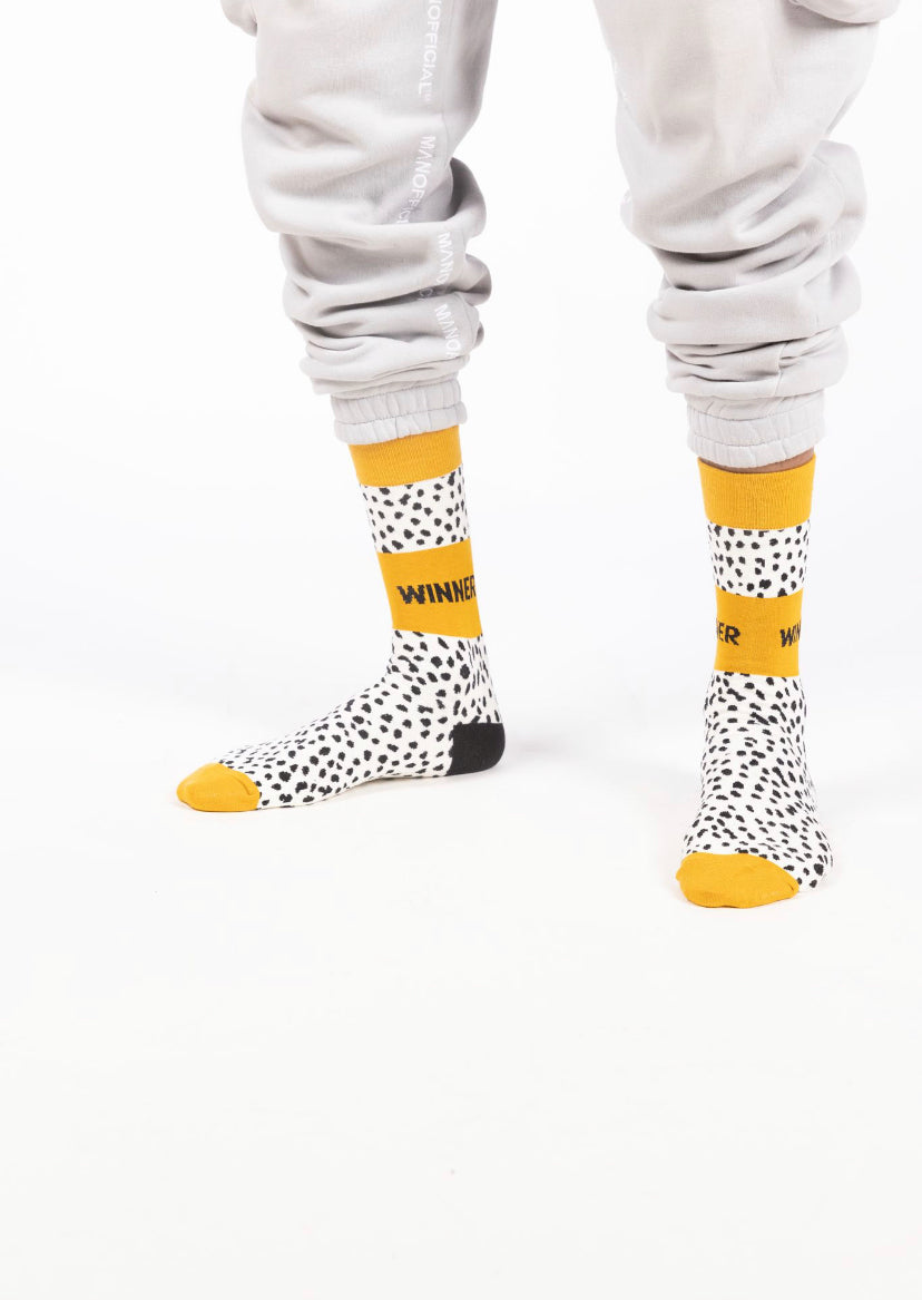 The WINNER Sock is a signature design by Dropashoe. These are Fashion forward, fashion statement socks to enhance your outfit with a bold expression. Motivate people with a positive message on your ankles! Mustard Yellow, Black and White cream base color with abstract design. Stand out with these unique design.